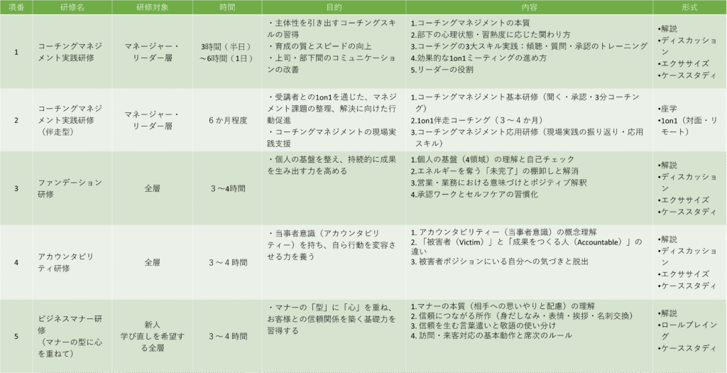 長年のコーチング経験をもとに、現場で活きる知見を体系化した実践型研修です。